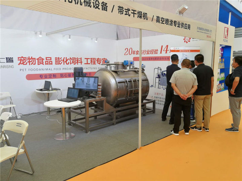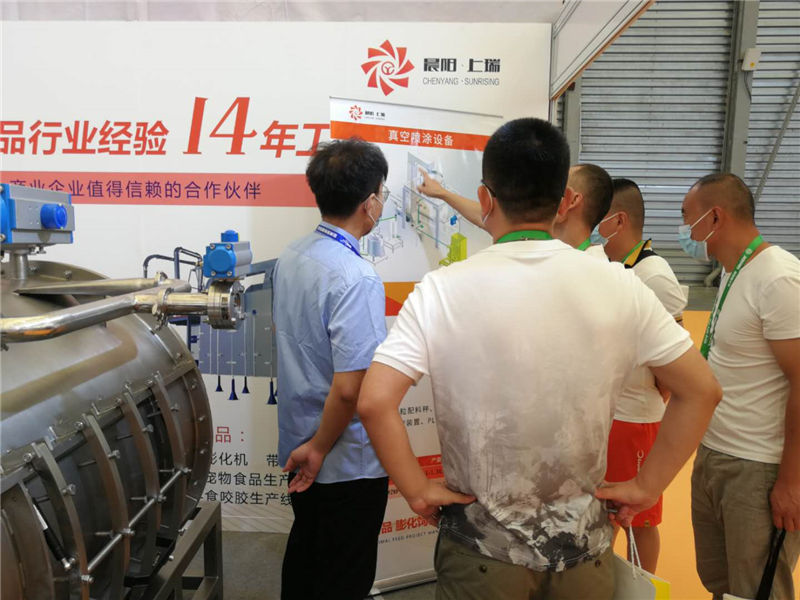 濟(jì)南晨陽公司作為寵物食品設(shè)備供應(yīng)商,以連續(xù)數(shù)界參加亞寵展覽會,本次展覽會我們展示新開發(fā)的真空噴涂設(shè)備,本噴涂設(shè)備主要應(yīng)用于時產(chǎn)2.5噸以高能寵物糧生產(chǎn)線的高油脂產(chǎn)品加工,填補了國內(nèi)無小型自動真空噴涂設(shè)備的空白,該產(chǎn)品一經(jīng)亮相,在展會就有大批客戶不斷咨詢該產(chǎn)品的技術(shù)問題。