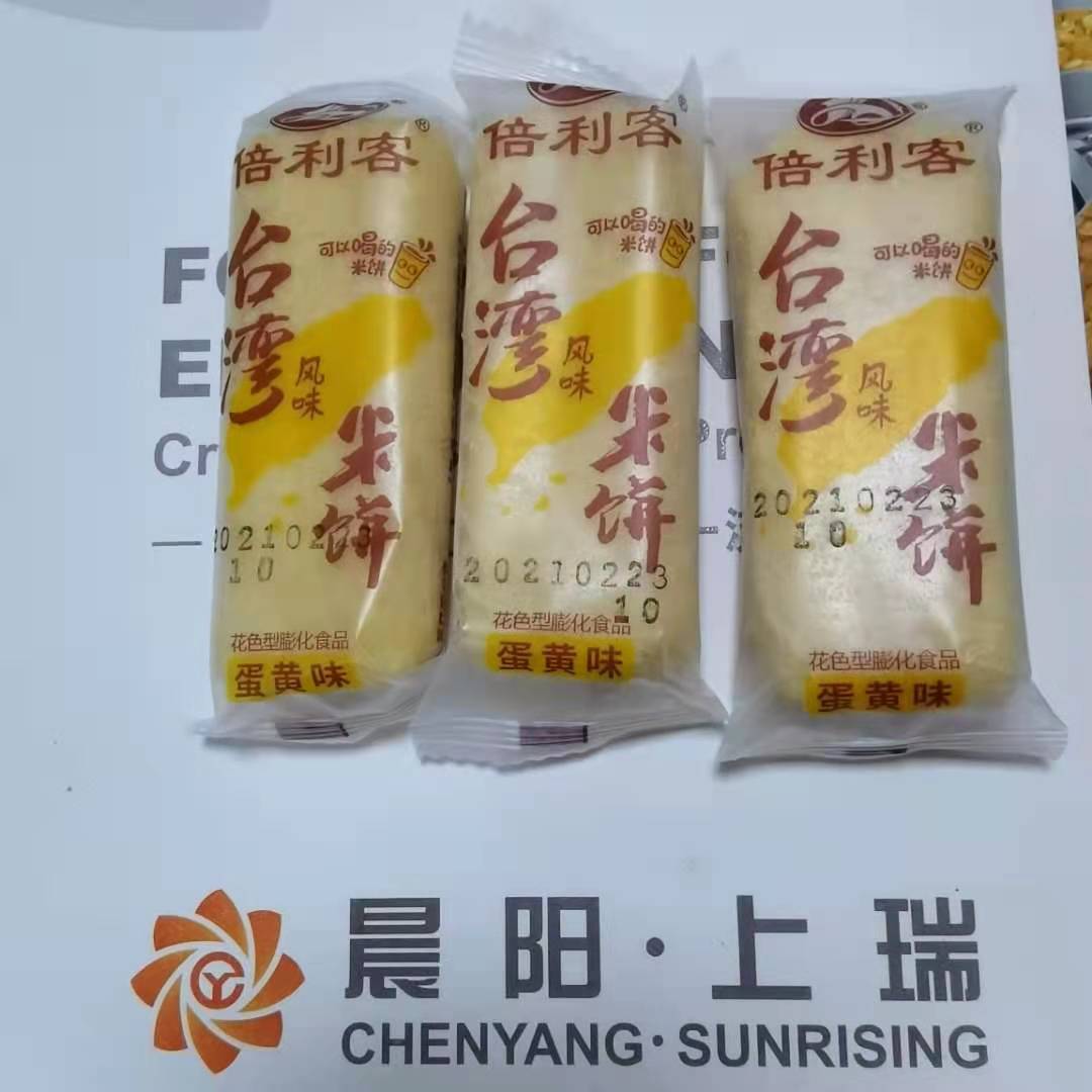 外表用擠壓膨化的工藝做出空管,不論是圓形管狀還是方形管狀,外表膨化成型,空心部分用其他的芯料填注,然后切斷成型,外表的擠壓膨化成型和內(nèi)芯的灌注是在雙螺桿膨化機(jī)的機(jī)頭模具被擠出的過程中同時(shí)進(jìn)行并實(shí)現(xiàn)的。芯料也各異:糖稀,果醬,巧克力醬,甚至各種其他的流型較強(qiáng)的芯料都可以自由使用,從而變化夾心米果最終的口感,影響其市場(chǎng)歡迎度。