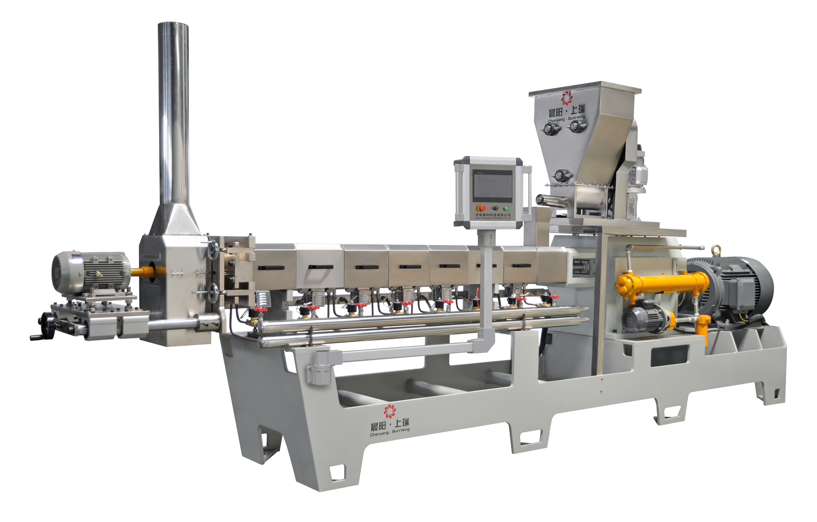 膨化機(jī)的工作原理其實也比較簡單,在膨化機(jī)概述中我們講到過,膨化機(jī)是利用機(jī)械能轉(zhuǎn)熱能來提供動能的,通常是利用膨化機(jī)的不等距非標(biāo)準(zhǔn)螺旋系統(tǒng)的擠壓推進(jìn),物料中的氣體被排出,并迅速被物料填充,物料受剪切力作用而產(chǎn)生回流,使機(jī)膛內(nèi)的壓力增大,之后同時機(jī)械能通過物料在膛內(nèi)的磨擦作用而轉(zhuǎn)化為熱能,使物料成為具有流動性質(zhì)的膠凝狀態(tài),物料被擠壓到出口時壓力由高壓瞬間變?yōu)槌海筛邷厮查g變?yōu)槌?,造成水分迅速地從組織結(jié)構(gòu)中蒸發(fā)出來,隨著摞旋與機(jī)膛間的磨擦使物料充分混合、擠壓、加熱、膠合、糊化而產(chǎn)生組織變化,原有的結(jié)構(gòu)受到破壞,使其內(nèi)部形成無數(shù)微孔結(jié)構(gòu),再通過切割裝置,切割冷卻即膨化食品就成形了。