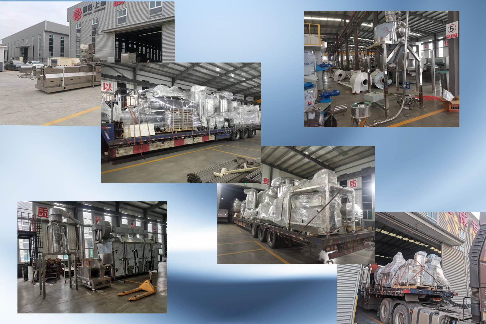 生產線主要設備:無塵投料站,槳葉式混合機、暫存?zhèn)}、雙螺桿膨化機、負壓輸送-干燥冷卻一體機、除塵式粉碎機、篩選機、成品倉。