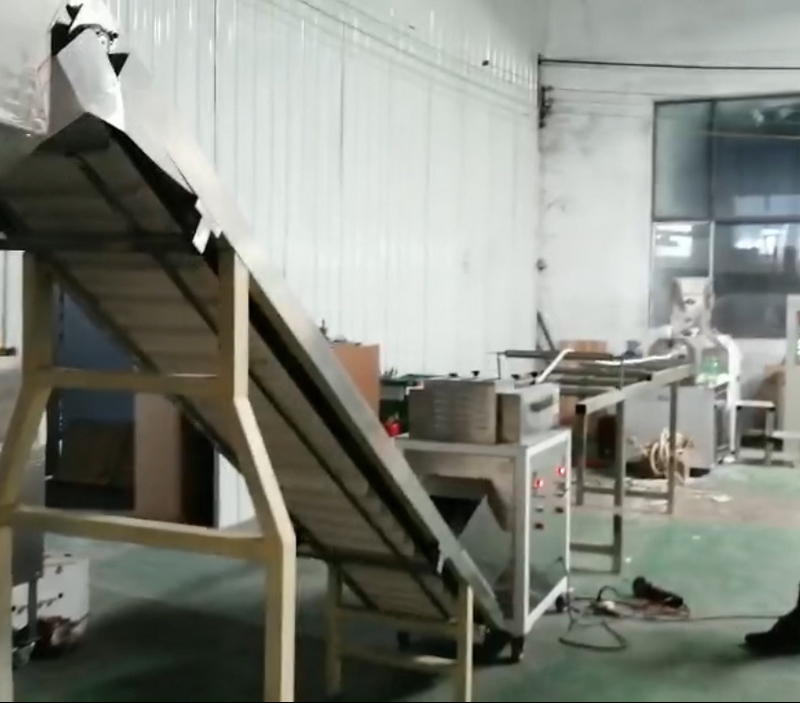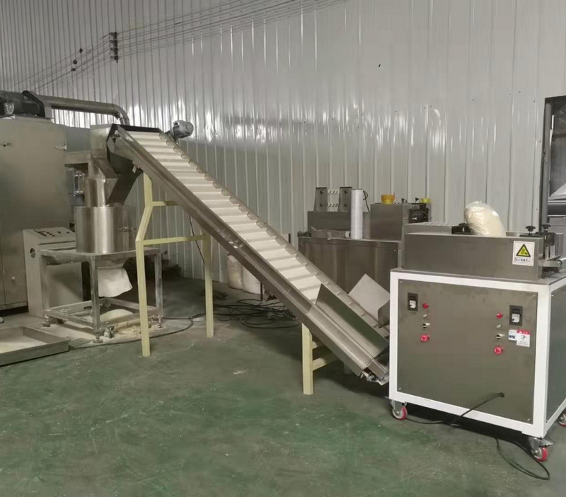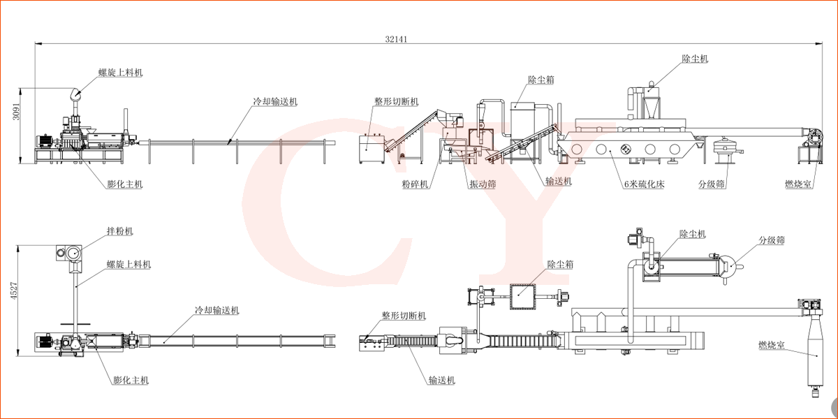拌粉機(jī)→螺旋提料機(jī)→膨化主機(jī)→冷卻輸送-切斷機(jī)→提升機(jī)-粉碎機(jī)-除塵機(jī)-篩選機(jī)-提升機(jī)-震動硫化床