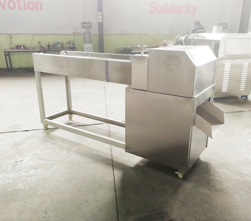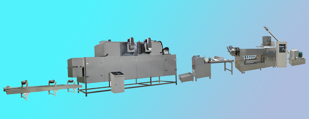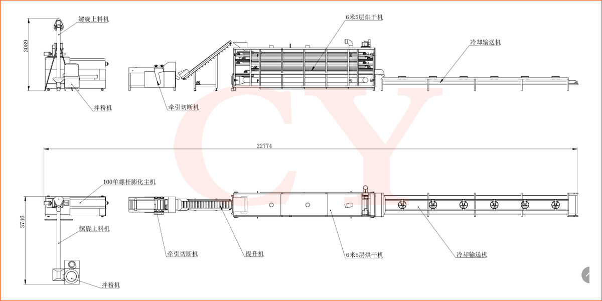 拌粉機(jī)→螺旋上料機(jī)→雙螺桿膨化機(jī)→切斷機(jī)→提升機(jī)→烘干機(jī)
