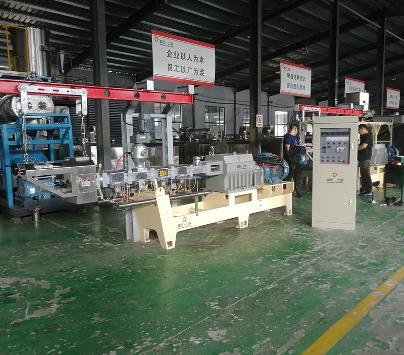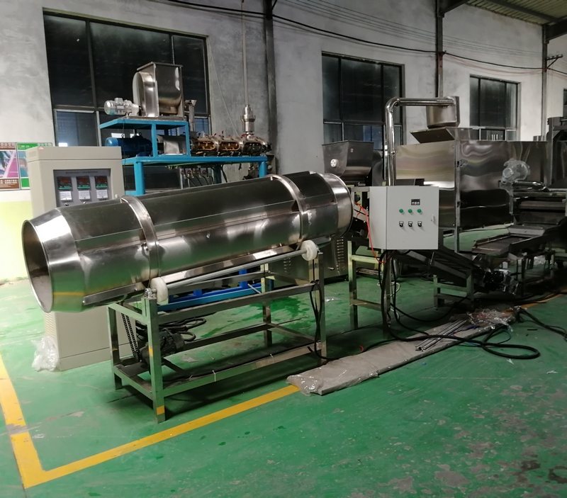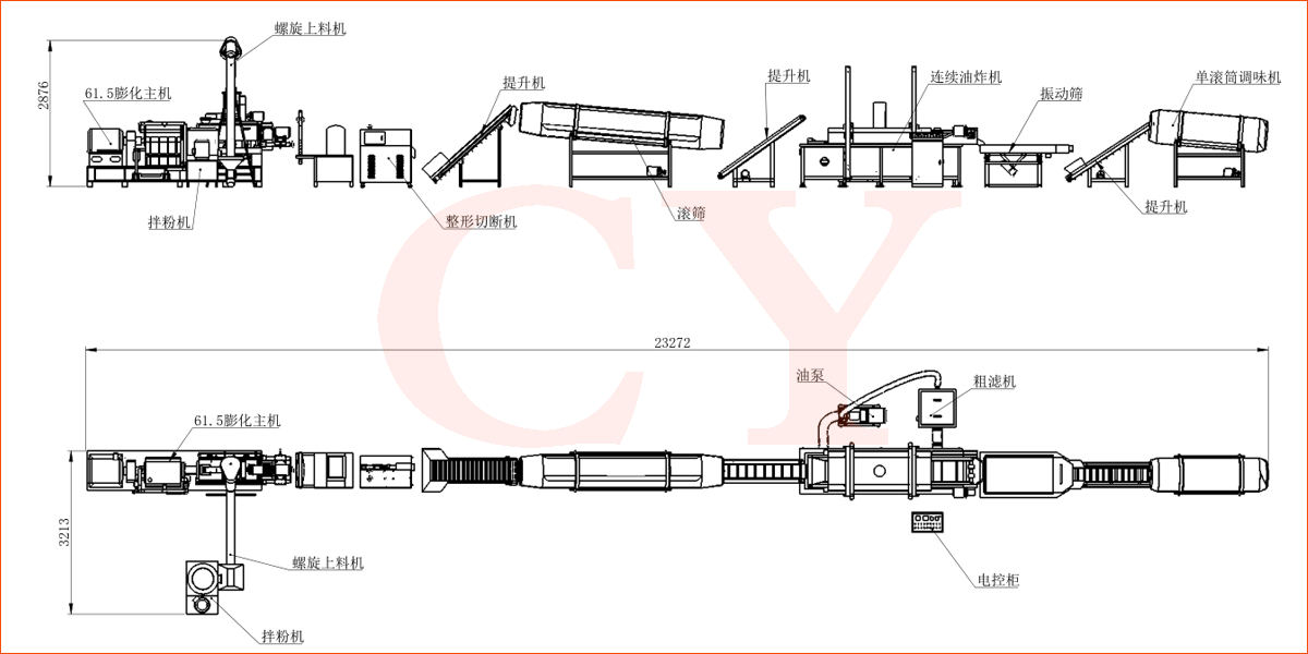拌粉機(jī)→螺旋輸送機(jī)-雙螺桿膨化機(jī)-展品壓延機(jī)-三角切斷機(jī)-提升機(jī)-連續(xù)油炸機(jī)-單滾筒調(diào)味機(jī)