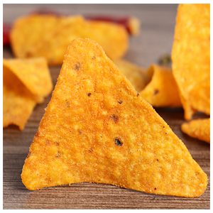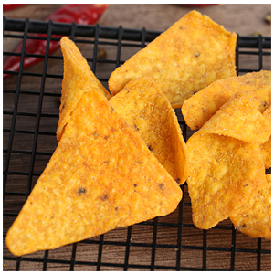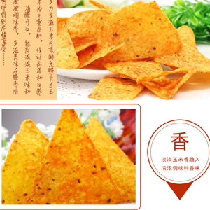 三角片/多力多滋/玉米薄餅生產(chǎn)線是玉米粉經(jīng)擠壓、成型及油炸調(diào)味而成。它的主要配料是玉米粉、水、植物油和鹽。經(jīng)過油炸后,用各種味道的調(diào)味粉噴灑在表面。因其清脆可口,而備受兒童 及成年人的喜愛