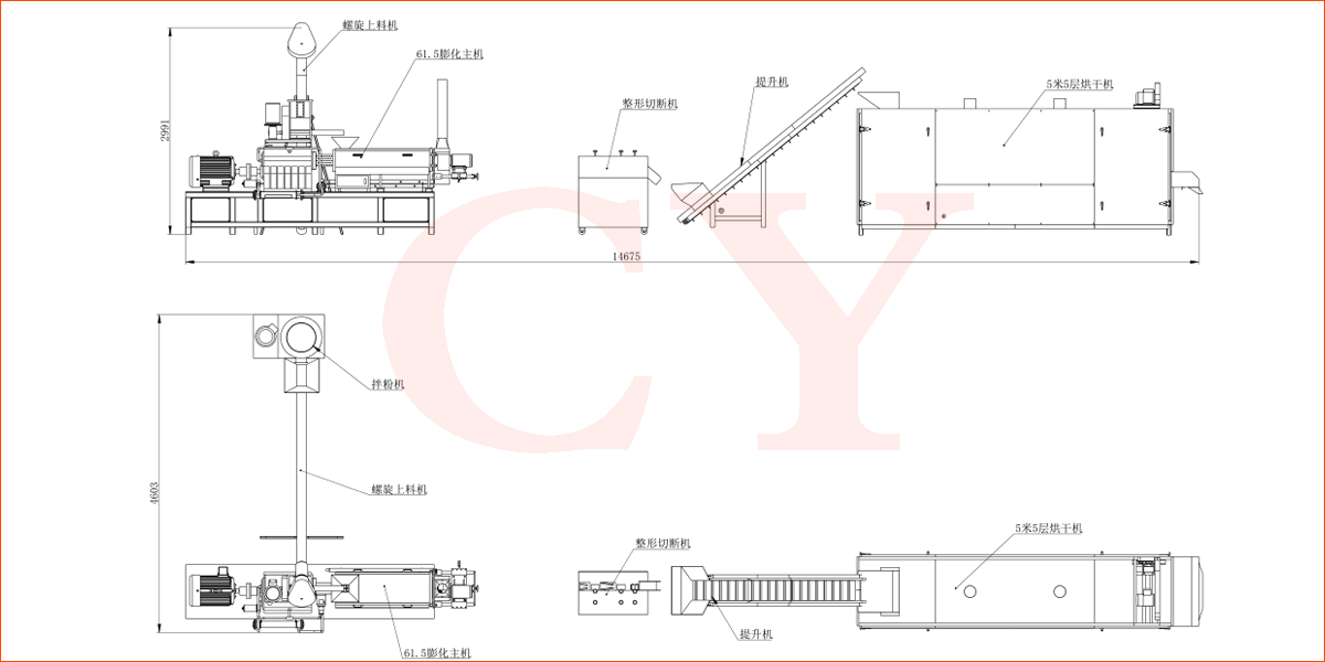 拌粉機→螺旋上料機→雙螺桿膨化機→切斷機→提升機→烘干機