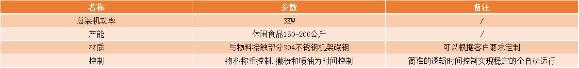 設(shè)備組成:400皮帶上料機、50kg稱重斗、25KG調(diào)味粉添加機、50L噴油機、50KG正反轉(zhuǎn)調(diào)味滾筒。