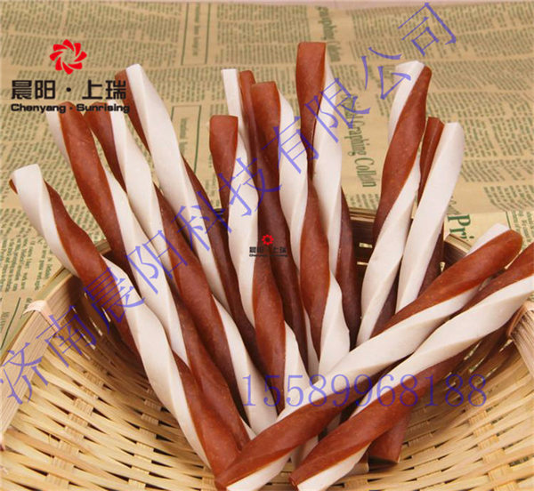 為滿足這一市場需求,晨陽人自公司成立之初,就加大力度投入技術研究,經(jīng)過十多年不斷摸索和實踐,掌握了成熟的制作狗咬膠的經(jīng)驗和方法。 采用科學配置的淀粉為原料,使用單螺桿擠壓機擠壓出客戶需求的各種形狀的狗咬膠,通過調(diào)整原料、溫度和水分等工藝參數(shù),生產(chǎn)出來的產(chǎn)品具有形狀新穎、口感獨特、營養(yǎng)豐富、組織細膩等特點。